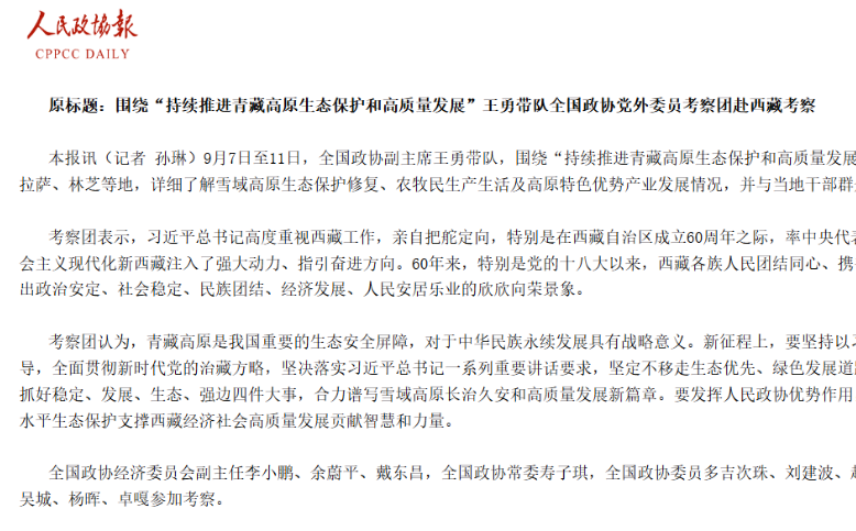 9月7日至11日,全國政協副主席王勇帶隊,圍繞“持續推進青藏高原生態保護和高質量發展”...